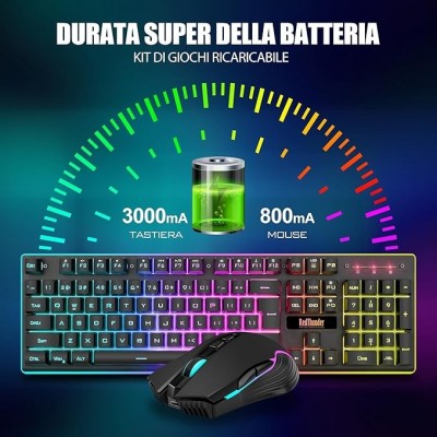【Batteria Ricaricabile e Lunga Durata】 La tastiera è dotata di una batteria da 3000 mAh e il mouse è dotato di una batteria da 800 mAh. La lunga durata della batteria consente di utilizzarli ininterrottamente per 8 ore con la luce. La tastiera e il mouse sono dotati di funzioni intelligenti di risparmio energetico. Se non ci sono operazioni entro 2 minuti, andranno automaticamente a dormire, premere un tasto qualsiasi per svegliarli. Si prega di caricare 8 ore prima dell'uso.