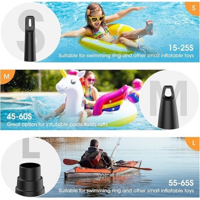 【Inflazione e sgonfiaggio più veloci】- L'inflazione e lo sgonfiaggio possono essere completati in pochi secondi o alcuni minuti, a seconda della dimensione dell'oggetto, grazie alla potenza elevata di 15 W e al flusso d'aria di 400 l/min. Basta inserire la bocchetta dell'aria nella valvola e accendere l'interruttore. Meno tempo di attesa significa più tempo per giocare o rilassarsi!