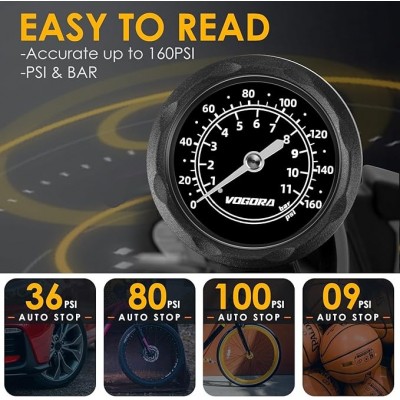[Valvola doppia] - Con la funzione delle doppie valvole Schrader e Presta, la pompa bicicletta VOGORA ti offre un'esperienza d'uso conveniente. Non devi fare scorta di tutti i tipi di ugelli per valvole diverse ed è sufficiente per te avere questo.