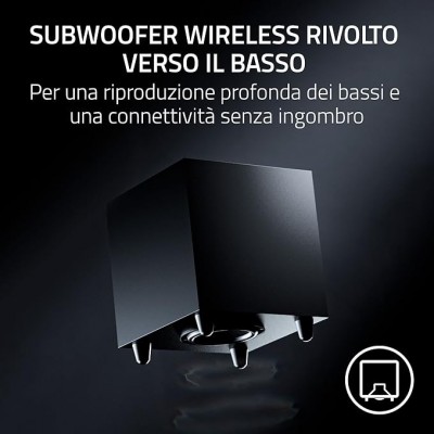Subwoofer wireless rivolto verso il basso per una riproduzione profonda dei bassi e una connettività senza ingombro: Il subwoofer del sistema è armato con un driver da 5,5" per bassi ricchi, potenti e vibranti È anche wireless, per ridurre al minimo i cavi e adattarsi senza ingombro a qualsiasi setup