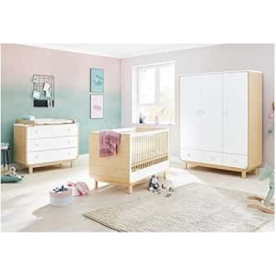• Habitación compuesta de cuna con base de listones y lados transformables, gran cambio de mesa con una mesa cambiante y un amplio armario con estantes ajustables de 5 altura y 1 subasta